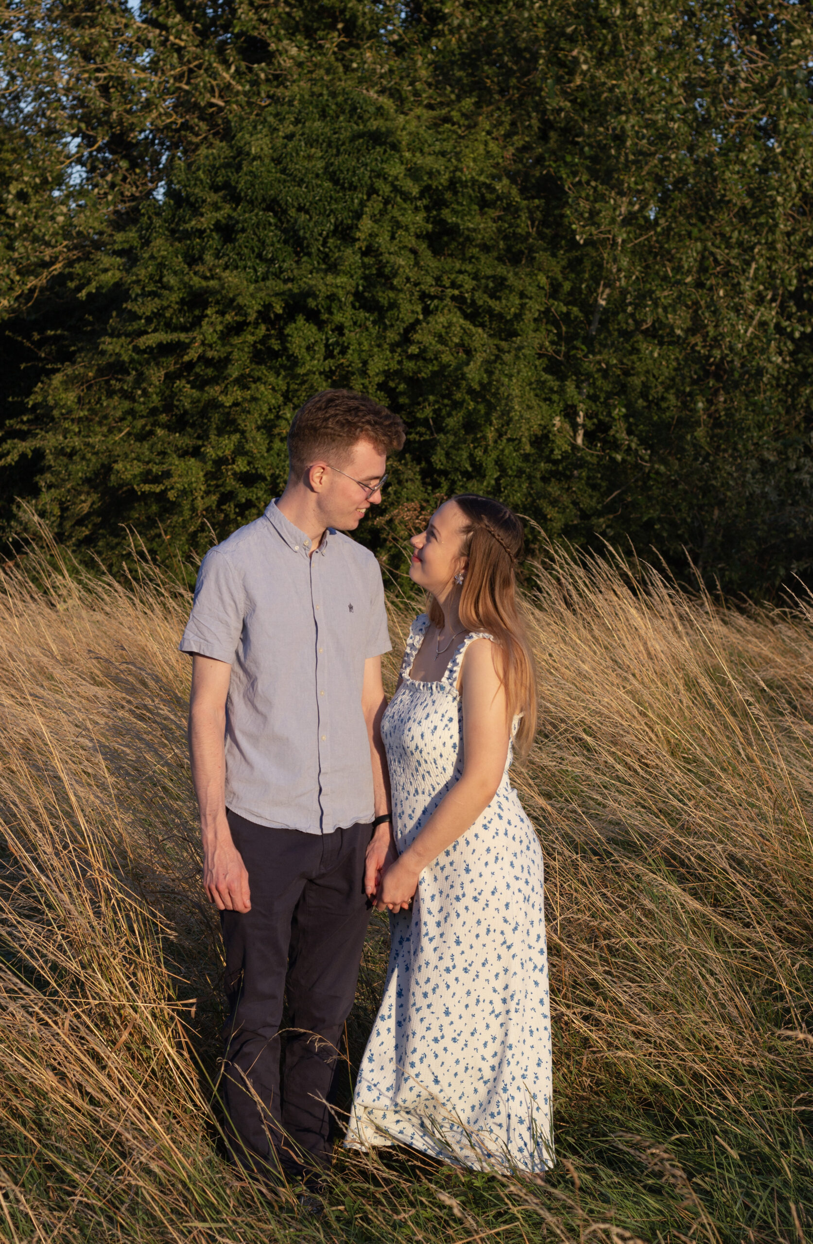 For this shoot, I threw in an additional evening slot, in advance of seeing heavy cloud forecast for the following morning, which was the original engagement photoshoot booking. We tracked the sunset to their local meadow and arrived in time for golden hour. On other photoshoots, I’ve had to adapt to extreme snow or heavy downpours. Often, these weather changes can lead to unique moments that I am able to capture thanks to being prepared with good gear, adaptable settings and an enthusiasm to make the most of it.